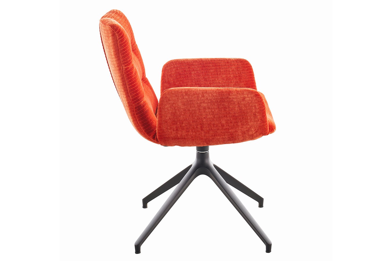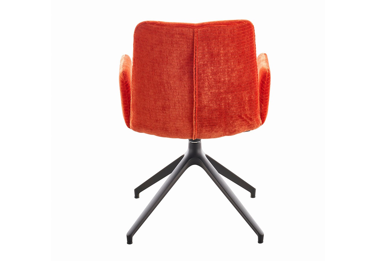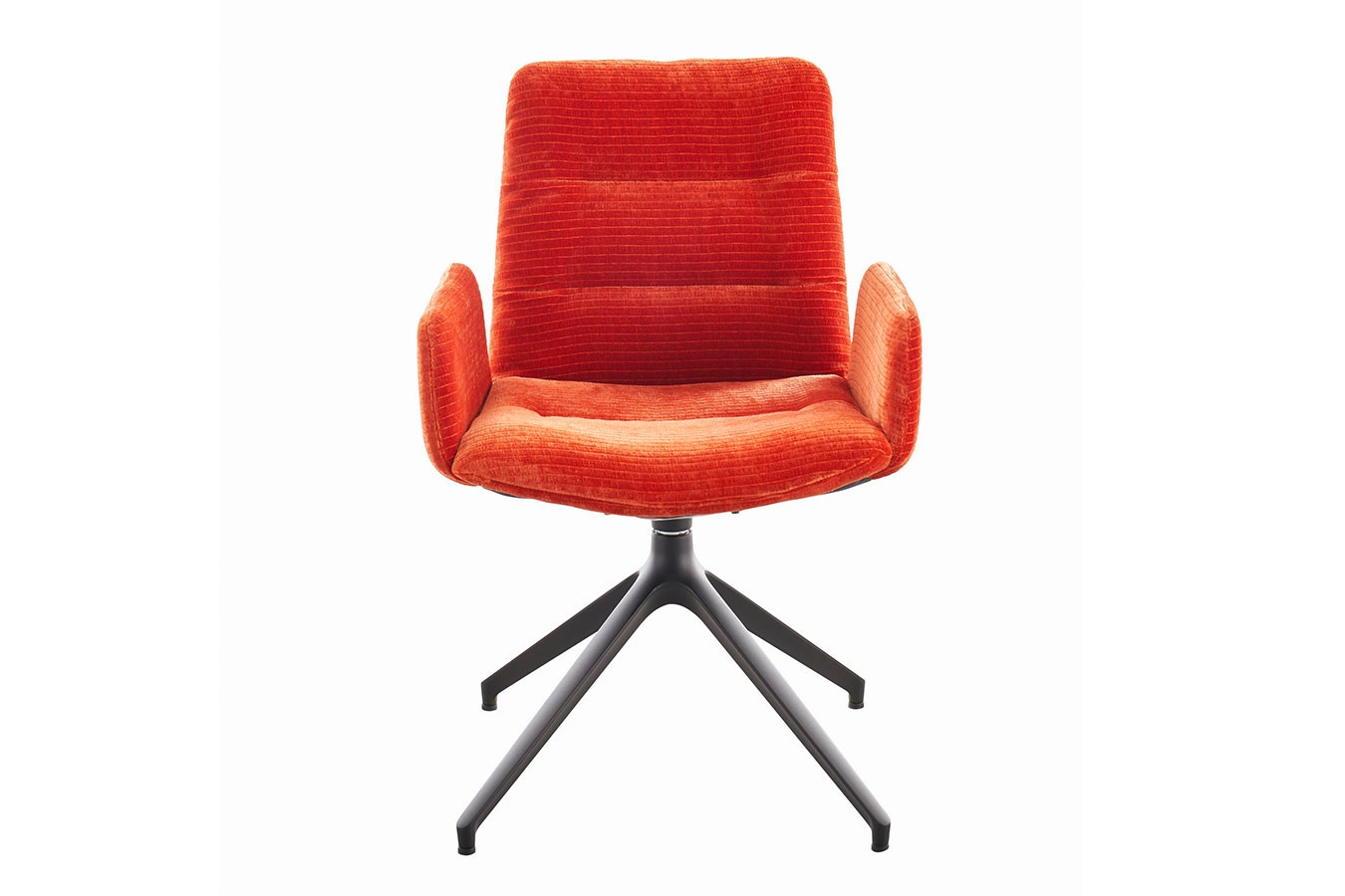 Das mattschwarze Metallgestell bildet nicht nur einen markanten Kontrast zum lebhaften Orange, sondern verleiht dem Stuhl auch eine moderne Note. Die geschwungene Form der Armlehnen und das drehbare Design tragen zur Funktionalität bei, während das stabile Metallgestell eine robuste Basis für den Sitzkomfort bildet.