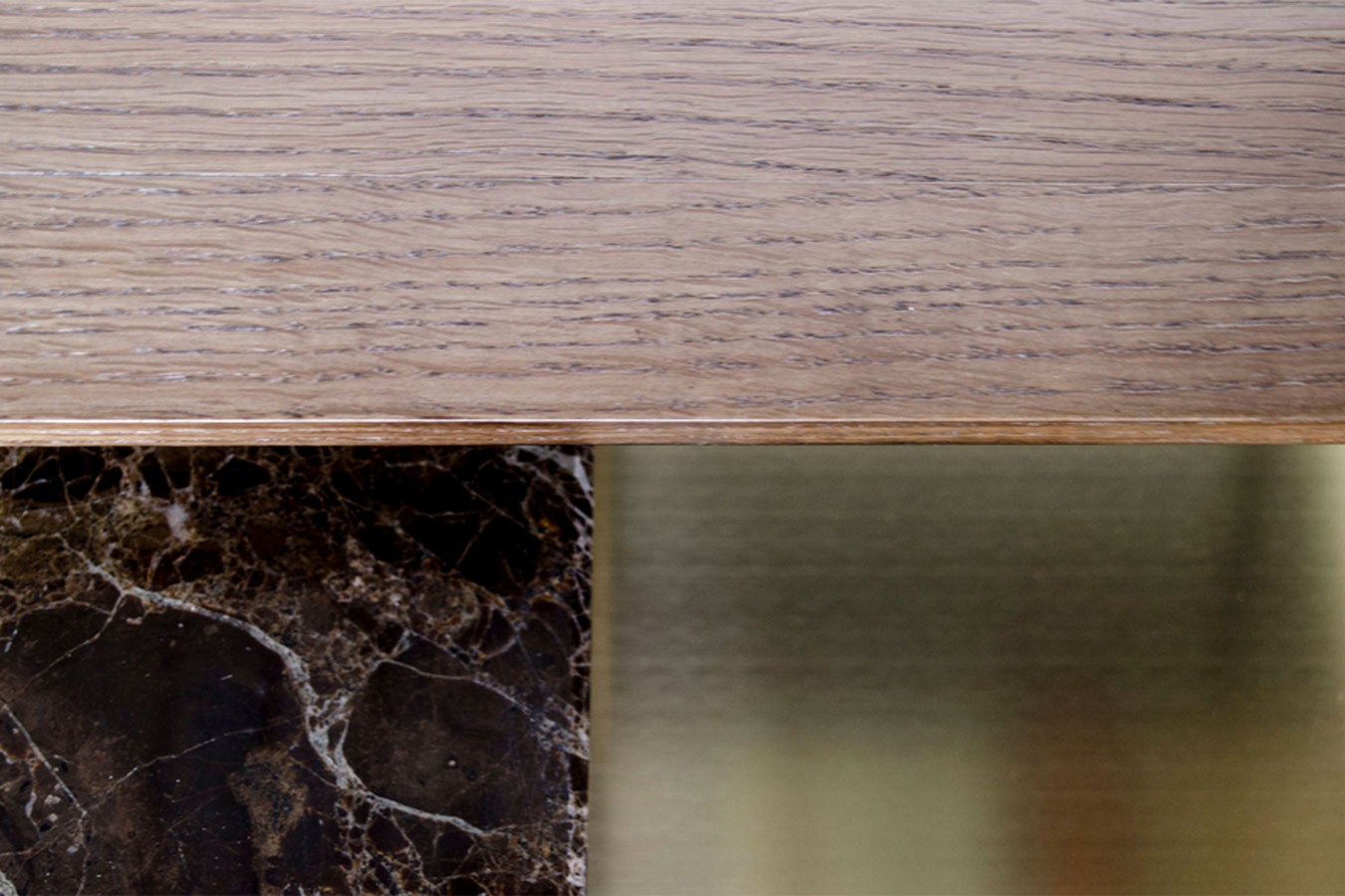 Sofatisch, Metallgestell Farbe messing, variable Ebenen aus Marmor, Eichefurnier