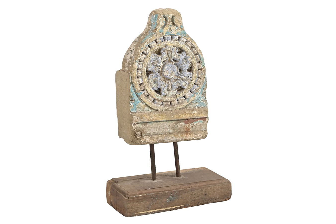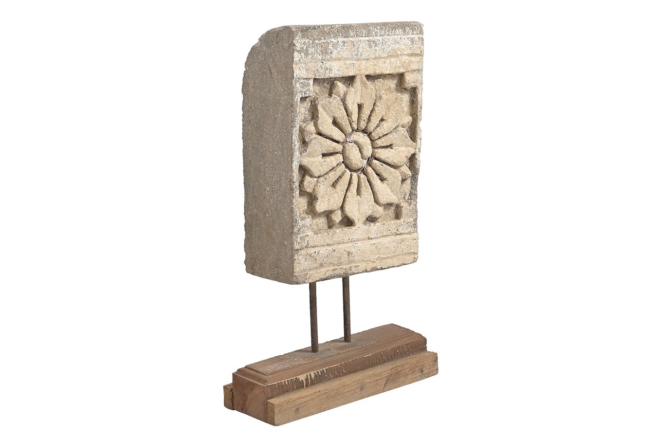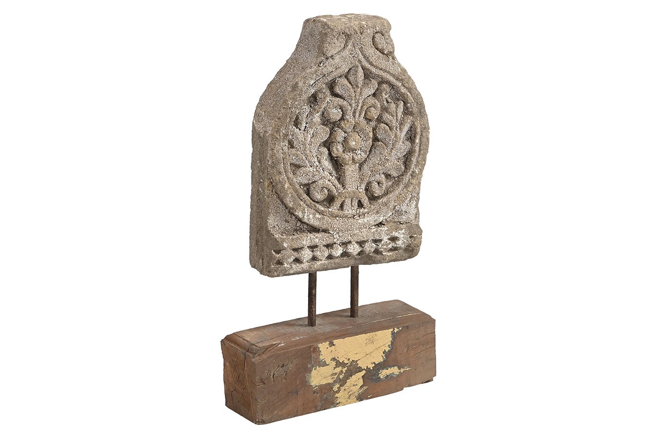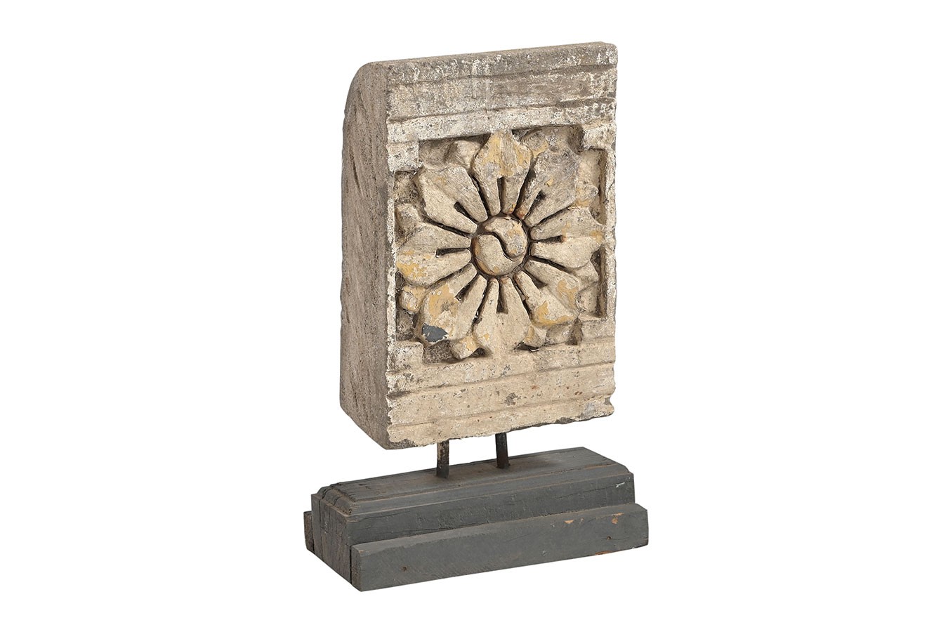 Florale Ornamente, Rosetten oder runde Reliefs: Diese dekorativen Objekte wurden aus alten Steinbauteilen herausgelöst und auf einfache Holzsockel montiert. Die Patina ist je nach Modell unterschiedlich – von naturbelassenem Stein bis zu Farbresten in Ocker oder Blaugrau.