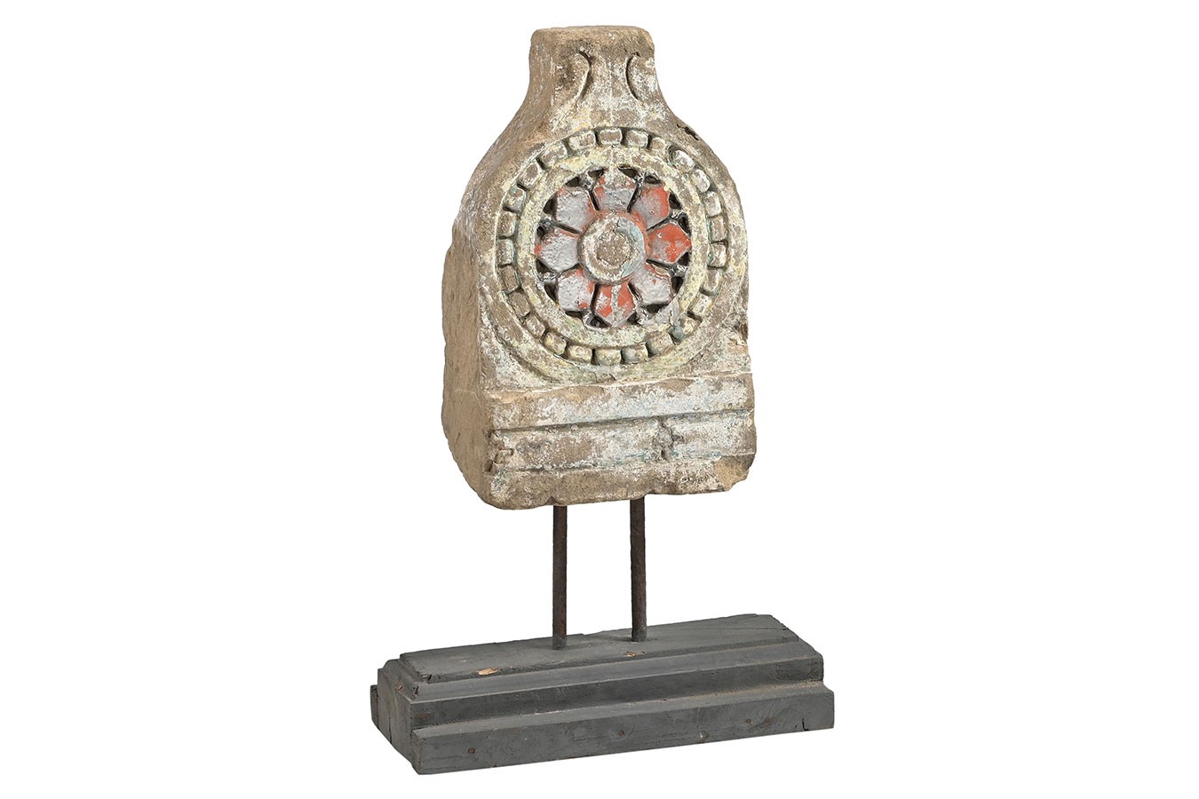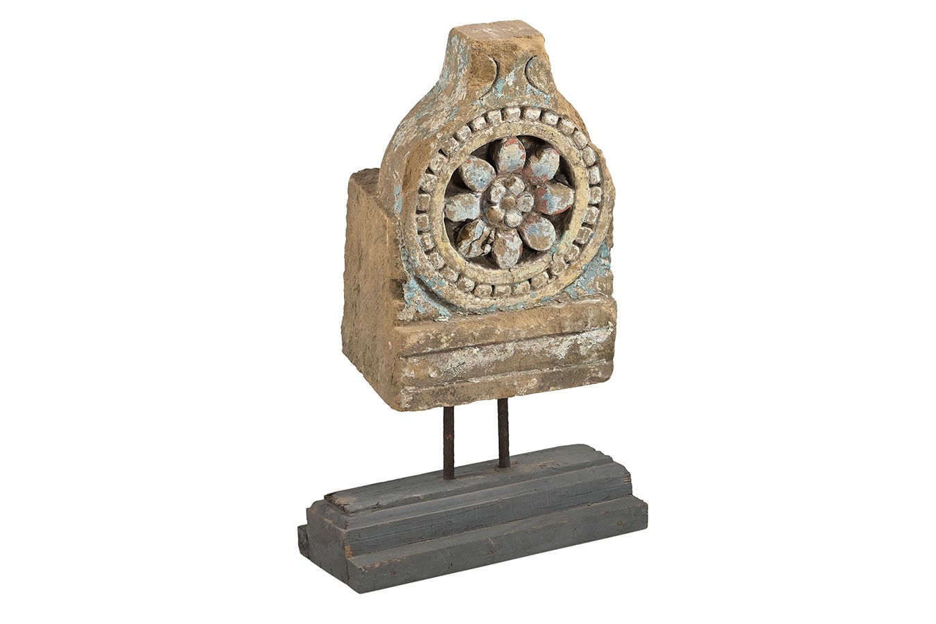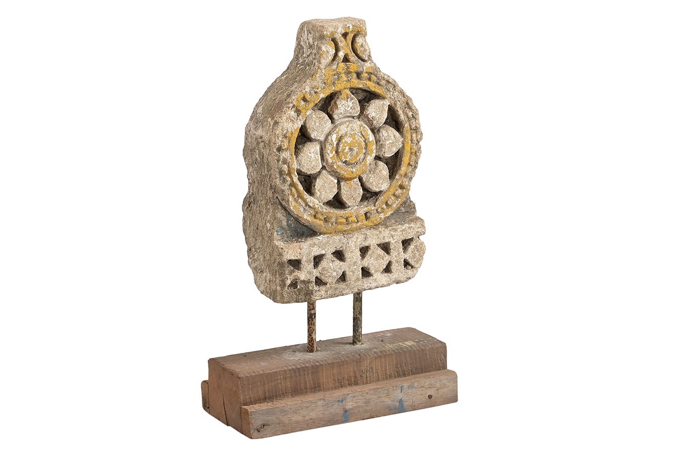 Florale Ornamente, Rosetten oder runde Reliefs: Diese dekorativen Objekte wurden aus alten Steinbauteilen herausgelöst und auf einfache Holzsockel montiert. Die Patina ist je nach Modell unterschiedlich – von naturbelassenem Stein bis zu Farbresten in Ocker oder Blaugrau.