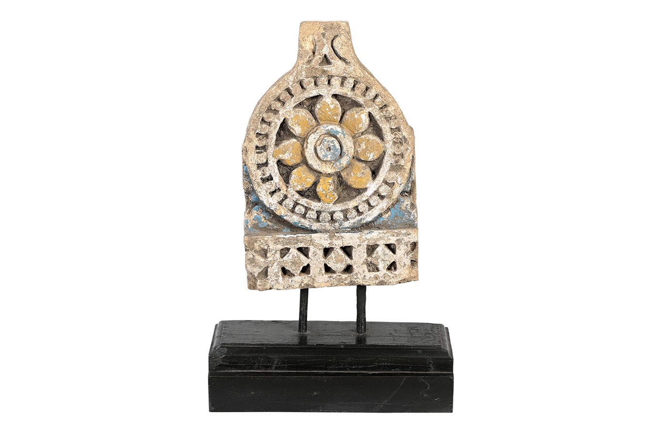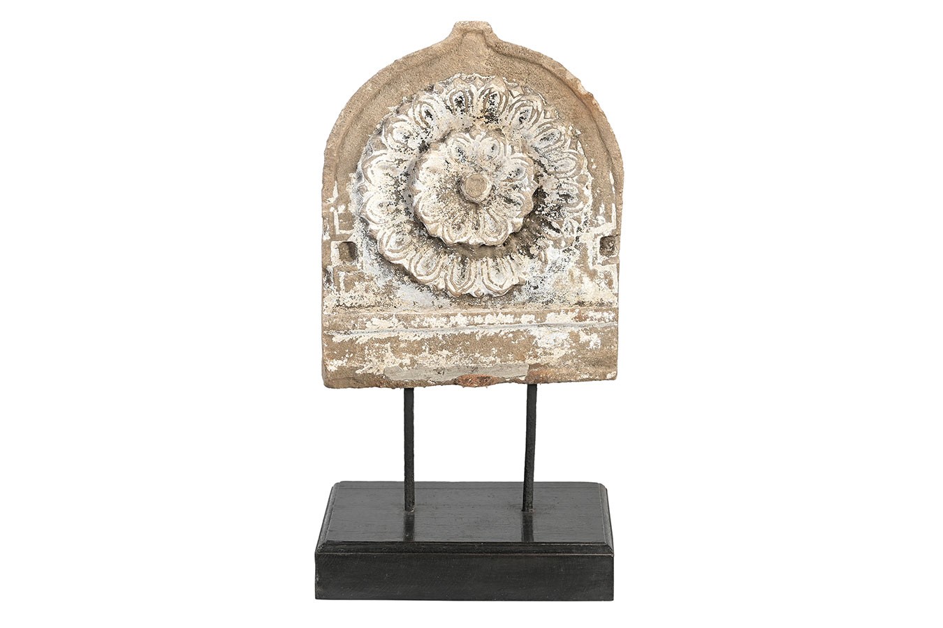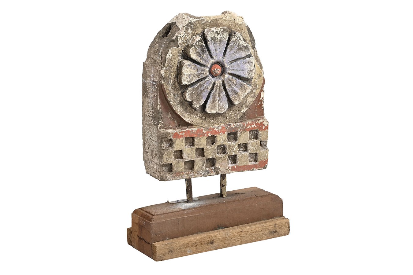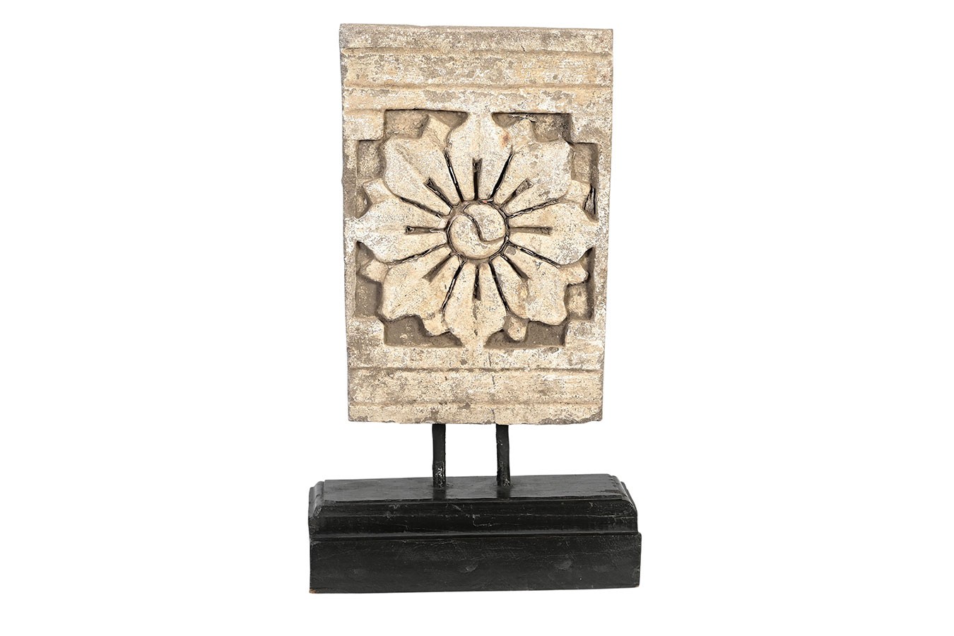 Florale Ornamente, Rosetten oder runde Reliefs: Diese dekorativen Objekte wurden aus alten Steinbauteilen herausgelöst und auf einfache Holzsockel montiert. Die Patina ist je nach Modell unterschiedlich – von naturbelassenem Stein bis zu Farbresten in Ocker oder Blaugrau.