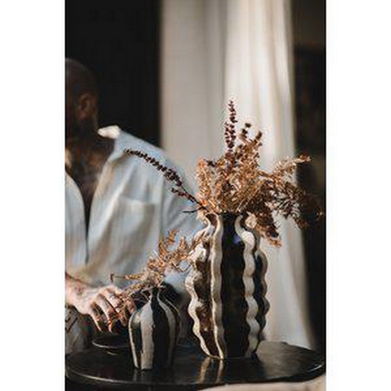 Willkommen in einer neuen Dimension von Eleganz und Kunst mit der Tule-Vase – einer ausdrucksstarken Vase, die nicht nur Blumen beherbergt, sondern selbst ein blühendes Kunstwerk ist. Trotz ihrer minimalistischen Größe wirkt die Vase außergewöhnlich und einzigartig und wird so schnell zum Lieblingsstück und Blickfang in Ihrem Zuhause. Tule ist weit mehr als nur eine Vase, sie ist eine Skulptur. Mit ihren schwarzen Streifen, die einen Kontrast zur eleganten Form bilden, erzeugt sie eine dramatische und moderne Ausdruckskraft. Die organische Form vermittelt ein Gefühl von Bewegung und Lebendigkeit und macht Tule zu einem wahren Augenschmaus. Die Vase ist aus Steinzeug mit einer reaktiven Glasur gefertigt, wodurch jede Vase ein Unikat ist. Dieses Produkt ist Teil der Jakobsdals-Kollektion in Zusammenarbeit mit der visionären Schöpferin und Designerin Storm Storm.