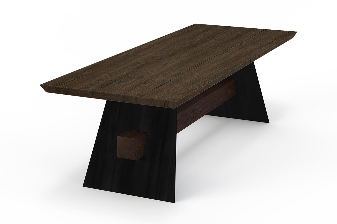 Die beiden Metallfüße in zeitlosem Schwarz sorgen nicht nur für Stabilität, sondern setzen auch einen modernen Akzent. Die Kontrastwirkung zwischen dem dunklen Metall und dem warmen Holz verleiht diesem Tisch eine zeitgemäße und dennoch rustikale Note.