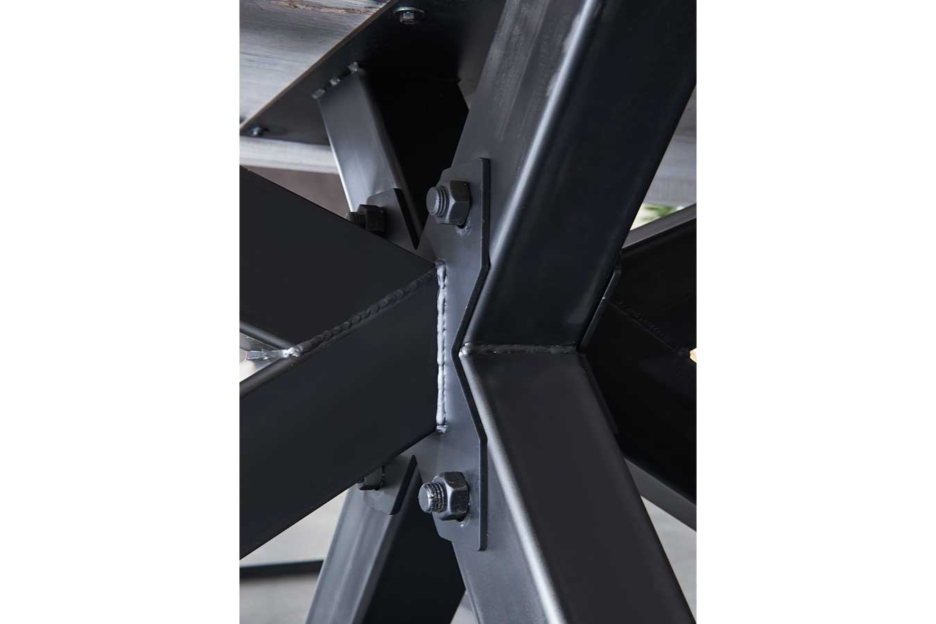 Der Tisch steht auf einem soliden Mittelfuß in eleganter Schwarz-Finish. Dieser Kontrast zwischen dem dunklen Fuß und der warmen Holzplatte verleiht Ihrem Esszimmer einen Hauch von Raffinesse und Modernität.