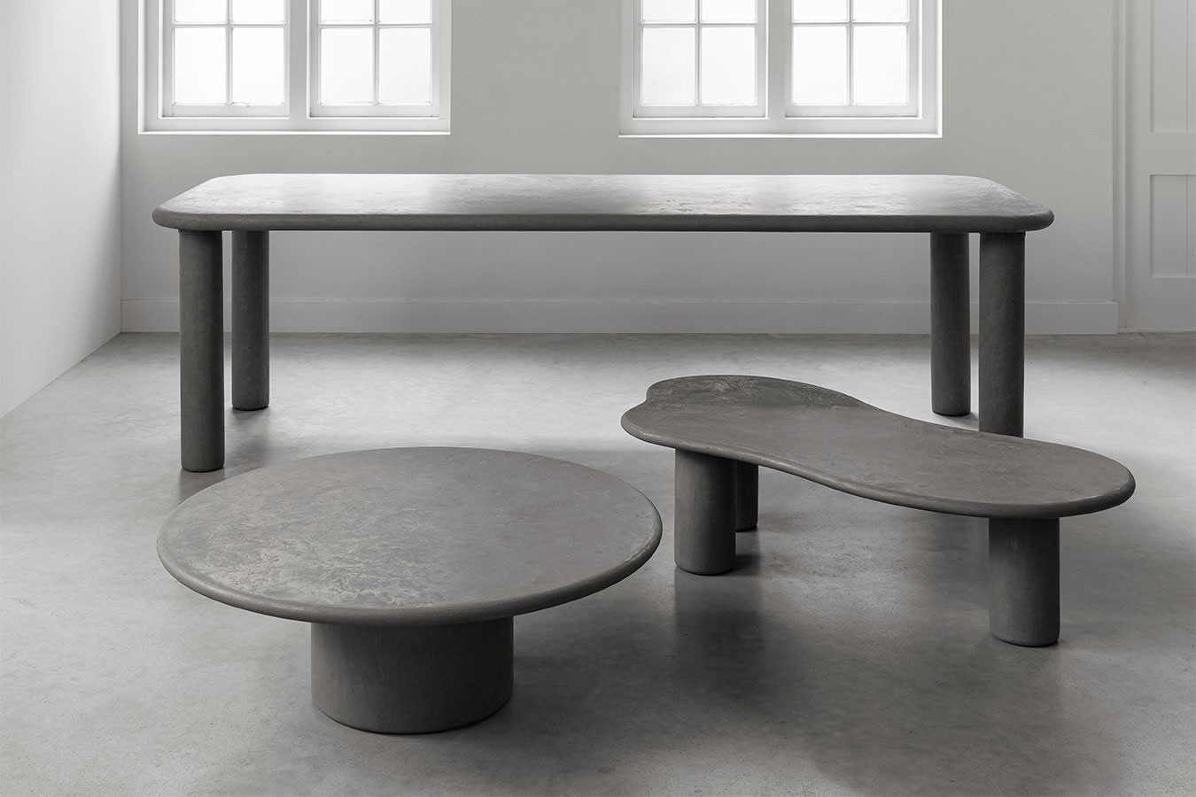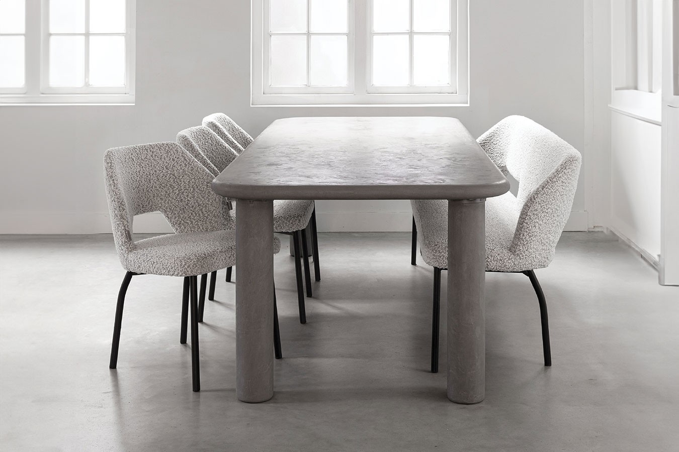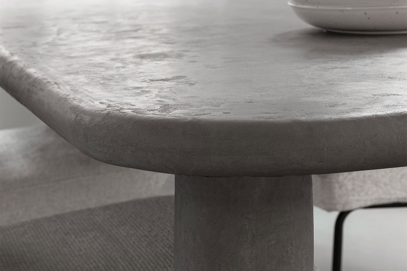 Alle vier Füße des Tisches sind rund und säulenförmig, was ihm Stabilität und Eleganz verleiht. Auch sie bestehen aus Mortex in Grau und bilden eine harmonische Einheit mit der Tischplatte. Die klare Linienführung und die schlichte Formgebung der Füße unterstreichen das moderne Design des Tisches und machen ihn zu einem echten Blickfang in Ihrem Esszimmer.