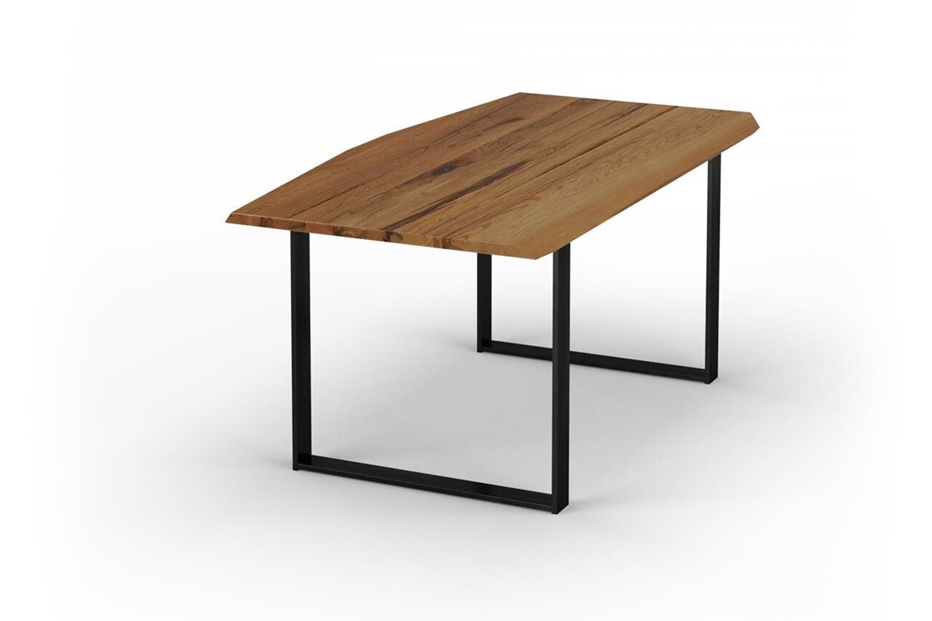 Küchentisch, Platte aus rustikaler Eiche mit extremer Kante, lackierte Oberfläche, Metallfüße in schwarz