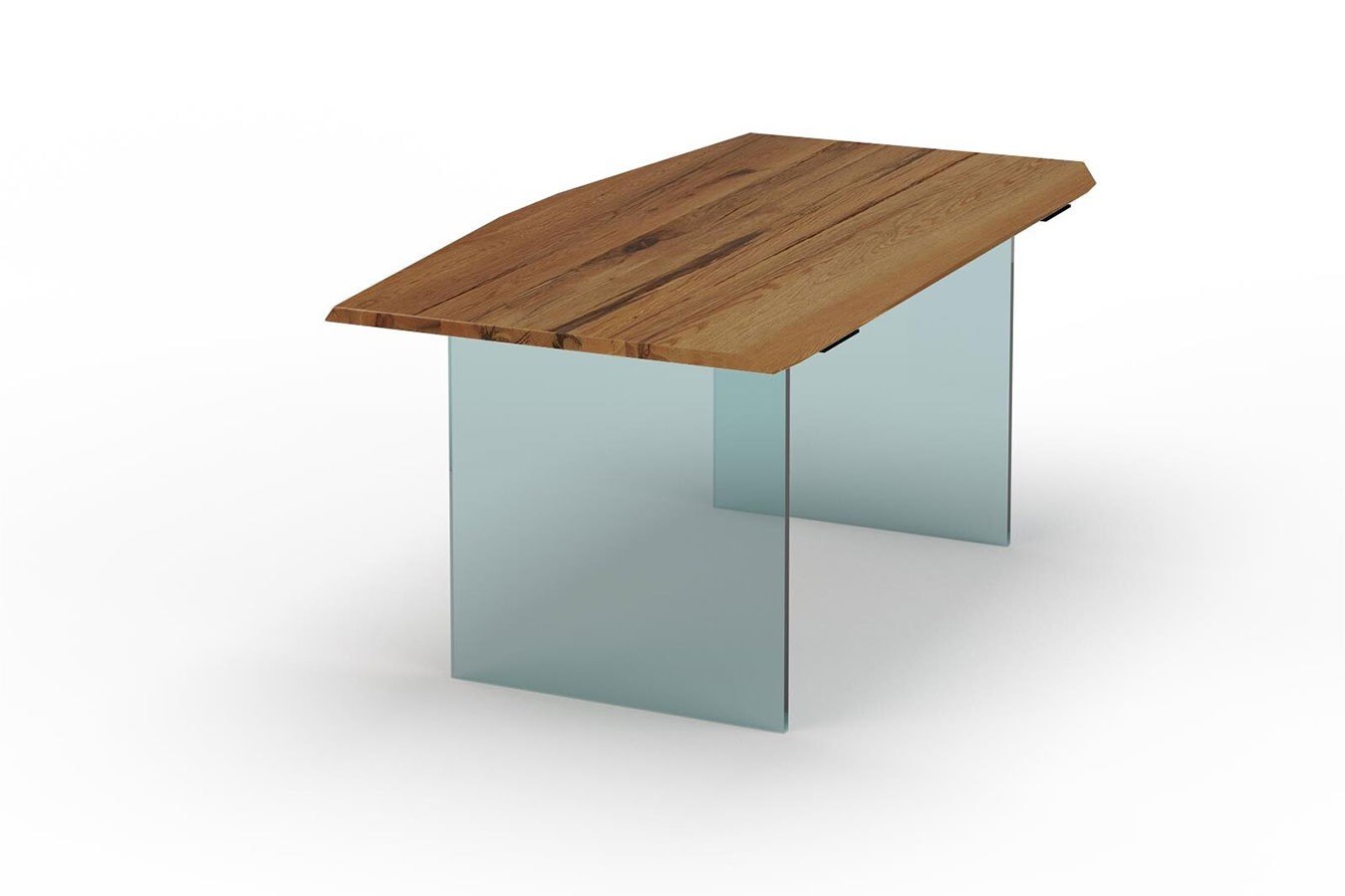 Küchentisch, Platte aus rustikaler Eiche mit extremer Kante, lackierte Oberfläche, Glaswangen transparent