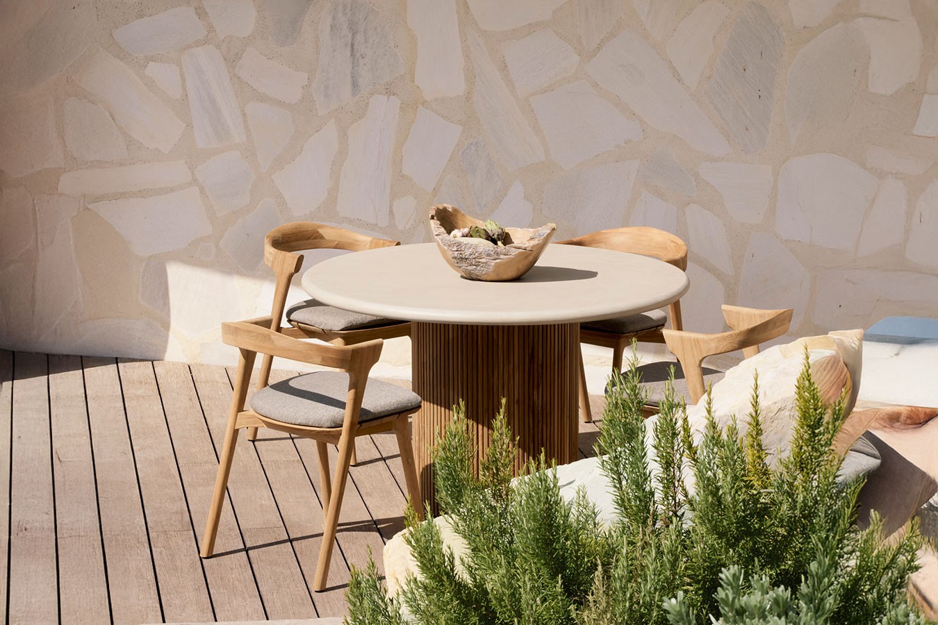 Die Kombination aus Beton und recyceltem Teakholz ist nicht nur optisch stimmig, sondern auch auf den Einsatz im Außenbereich ausgelegt. Beide Materialien sind widerstandsfähig und entwickeln mit der Zeit eine individuelle Oberfläche.