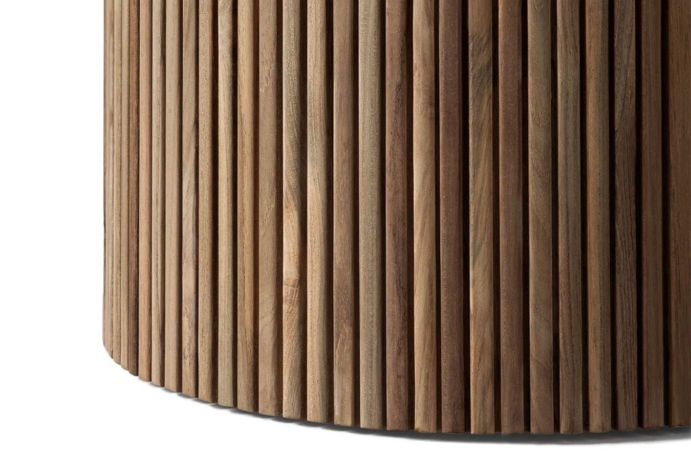Der Outdoor Esstisch Roller Max setzt auf eine klare, reduzierte Form und lebt vom spannenden Zusammenspiel seiner Materialien. Die runde Betonplatte wirkt ruhig und massiv, während der markante Säulenfuß aus vertikal angeordneten Teakholzleisten eine lebendige Struktur ins Design bringt.Die feine Linienführung des Gestells entsteht durch die Anordnung einzelner Holzstäbe, die dem Tisch eine besondere Tiefe und eine handwerkliche Anmutung verleihen. Gleichzeitig sorgt die massive Bauweise für Stabilität und einen sicheren Stand.