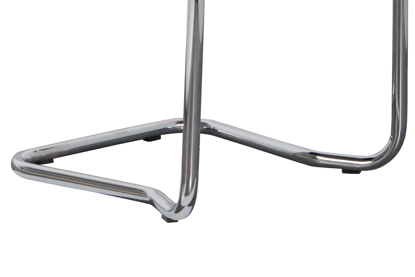 Das Freischwinger-Gestell aus gebogenem Metall sorgt für eine leichte, fast schwebende Wirkung und ermöglicht eine sanfte Federung beim Sitzen. Der strukturierte, gerippte Stoffbezug ist robust und bringt eine moderne Oberfläche ins Design.