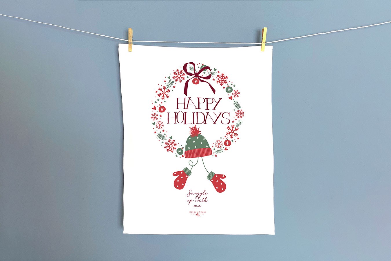 An Weihnachten wünschen wir uns alle Schnee und eisige Kälte. Auch wenn es in den letzten Jahren eher warm gewesen ist, geben wir die Hoffnung nicht auf. Mit dem passenden Geschirrtuch aus Baumwolle, das handgefertigt ist, manifestieren wir den Wunsch einfach. Auf diesem rot-grünen Kranz hängt am unteren Rand eine Mütze mit einem Handschuh Paar, das an lustige Schneetage erinnert. Auch dieses Set ist in den weihnachtlichen Farben designt. Im Kontrast dazu steht in roter Schreibschrift die Bitte, sich mit der Person im warmen Zuhause einzukuscheln und der Kälte keine Chance zu geben. Auch als Weihnachtsgeschenk eine schöne Idee!Was ist das Besondere an diesen Geschirrtüchern? Zwei Frauen, zwei Länder, eine Leidenschaft. Bei den Designerinnen von Hills of Hems handelt es sich um zwei Freundinnen, die aus ihrer Liebe zu schönen Dingen ihren Traum verwirklichten, selbst besondere und ausgefallene Wohnaccessoires herzustellen. Und der Name? Bezieht sich auf Hemsbach, einer Stadt im Rhein-Neckar-Kreis, aus welcher eine der beiden Freundinnen stammt. Regional durch und durch.