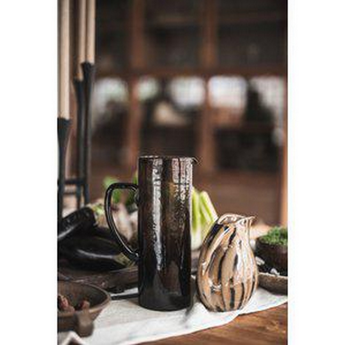 Verleihen Sie Ihren Speisen und Getränken mit unserer Glaskaraffe Puro einen Hauch von Eleganz und Kunstfertigkeit – eine wunderschöne Bereicherung für Ihre Küche. Diese Karaffe (9 x 26,5 cm) ist nicht nur ein Gefäß für verschiedene Getränke, sondern auch ein stilvolles Dekorationselement. Pure besticht durch ihre gehämmert wirkende Oberfläche, bei der jeder Zentimeter sorgfältig bearbeitet und geformt wurde, um ein einzigartiges, strukturiertes Muster zu erzeugen. Jedes Detail dieser Karaffe strahlt Eleganz aus und sorgt für ein faszinierendes visuelles Erlebnis. In ihrem rauchigen Dunkelbraun verströmt Pure Luxus und Raffinesse und macht Ihre Getränke zu einem besonderen Genuss.