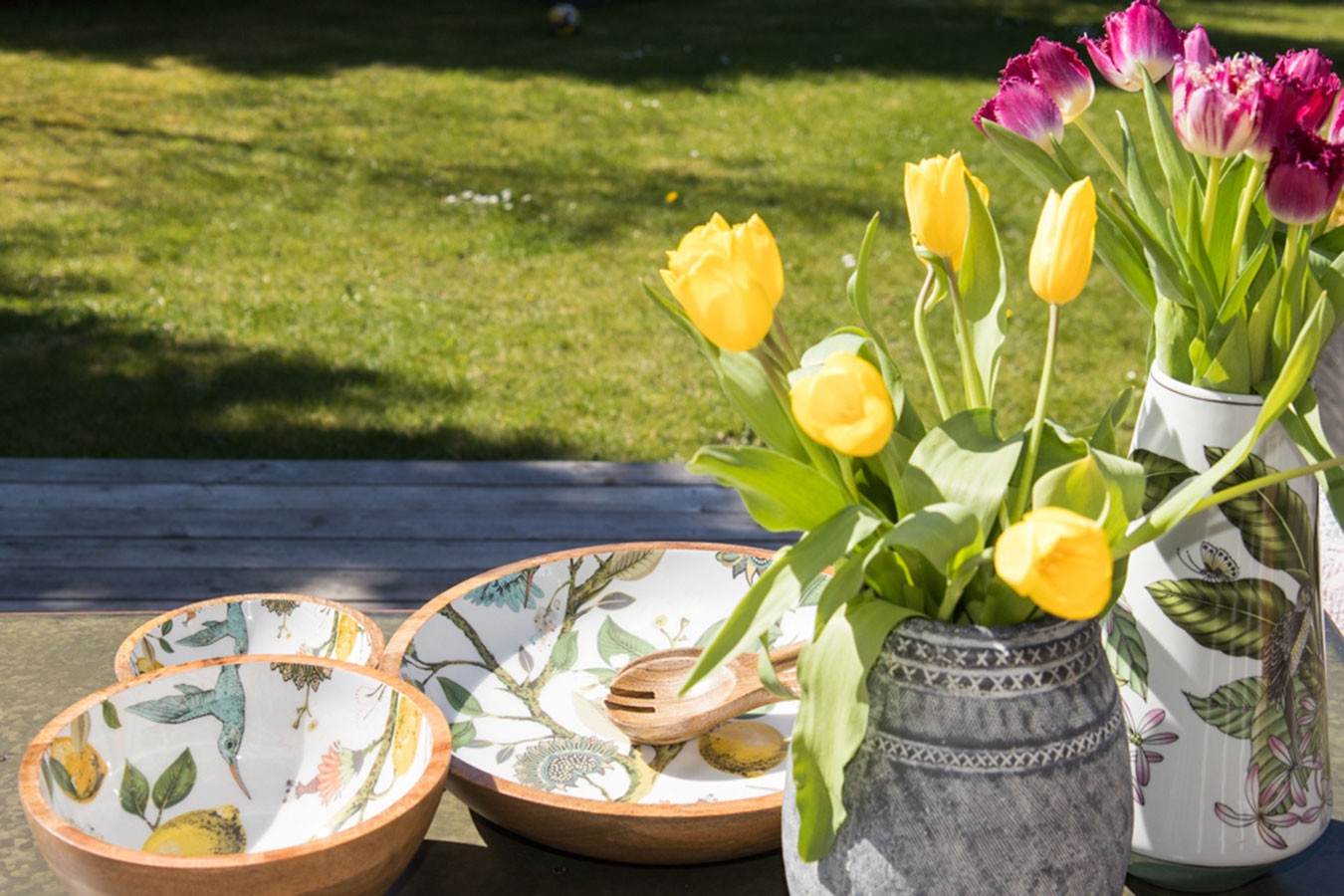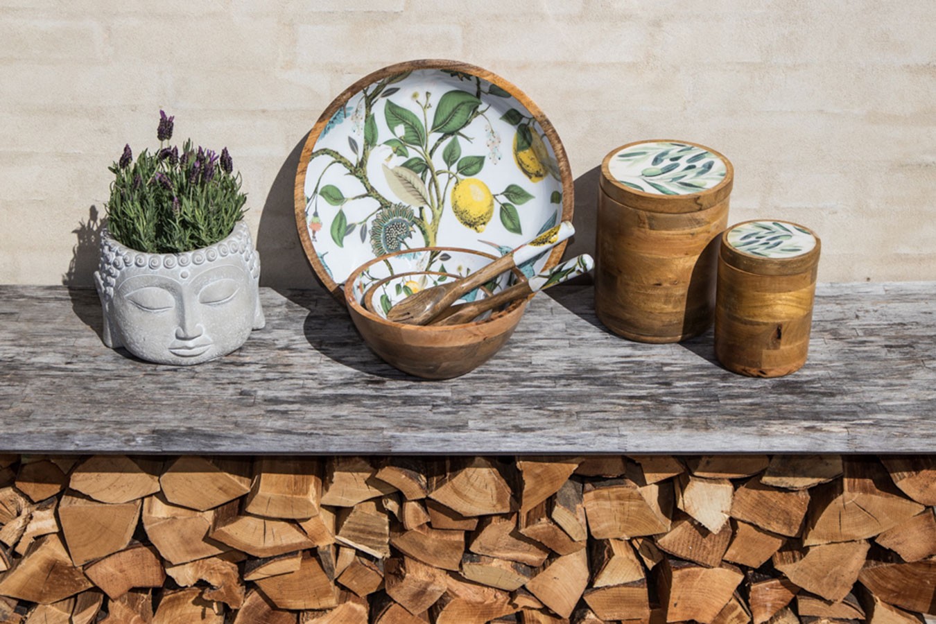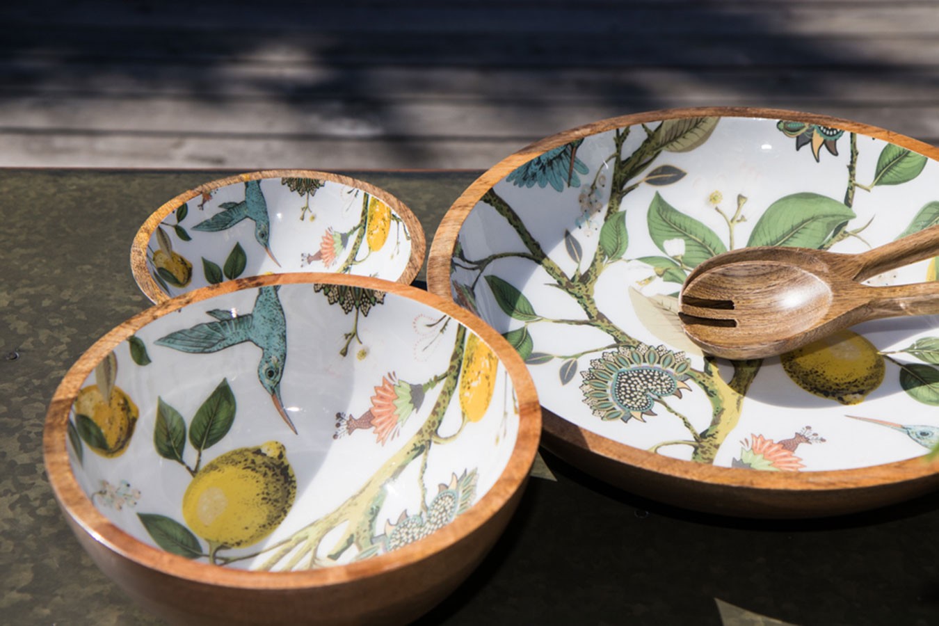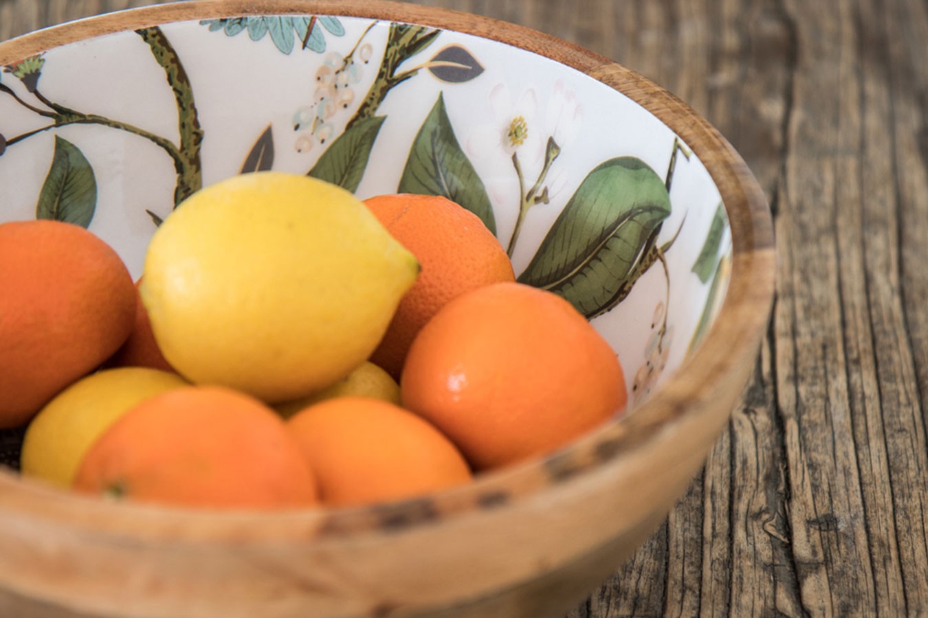Als Dekoration im Flur, zur Aufbewahrung von Obst oder zum Anrichten von leckeren Bowls eignet sich diese 25cm große Schüssel aus Mangoholz allemal. Das Geschirrstück, das innen aus Kunstharz besteht und mit einem fröhlichen bunten Muster ausgearbeitet wurde, sorgt bereits beim Anblick für gute Laune. Mit anderen Artikeln aus der "Lemon Bird"-Serie können Sie einen farbenfroh gedeckten Tisch kreieren, der nicht nur einladend wirkt, sondern auch Ihre Gäste begeistert.