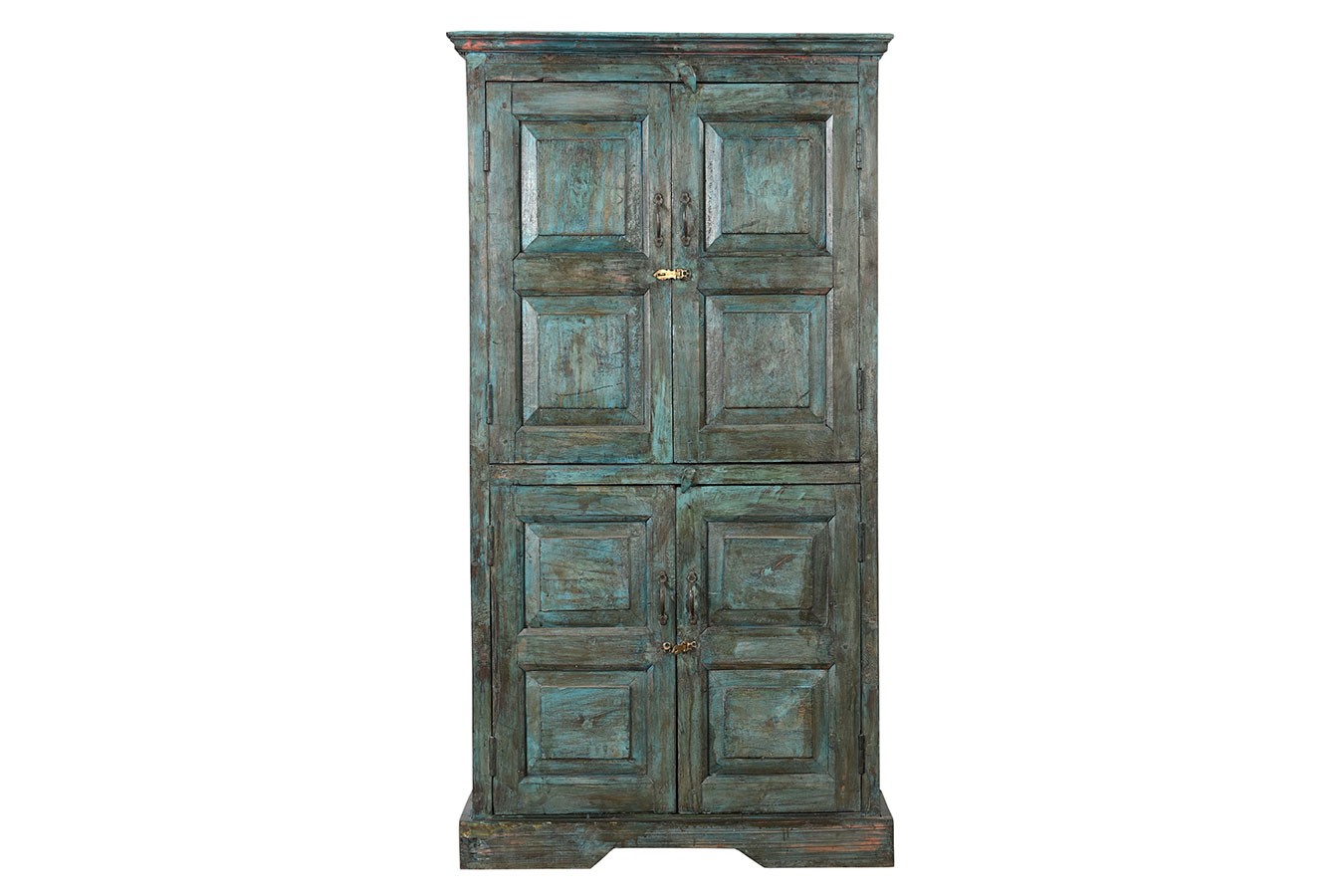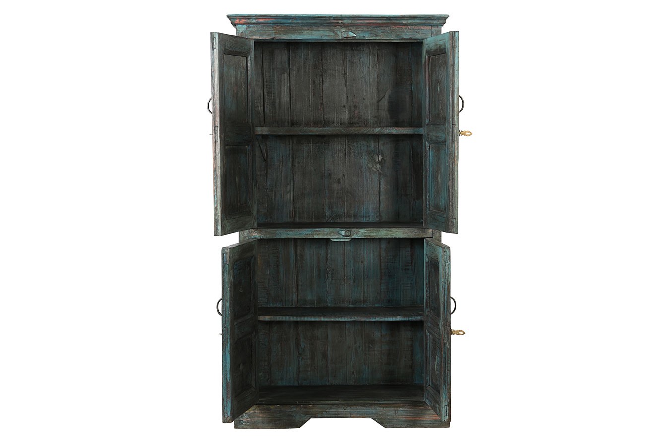 Kleiderschrank, 100% recyceltes Massivholz, 2-türig, 2 Regale, blaue Restpatina