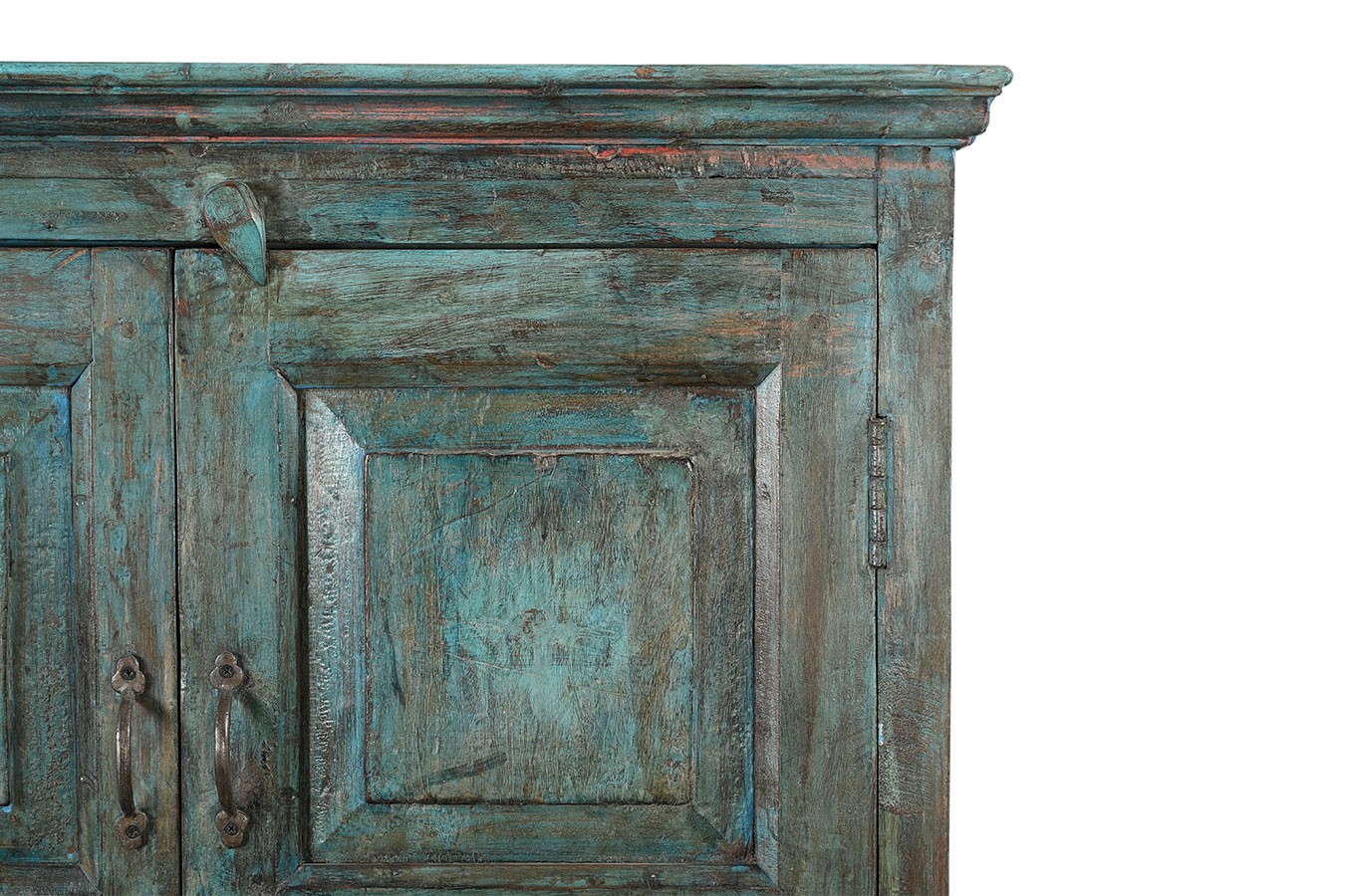 Das Möbelstück erstrahlt in einem frischen Blau, das durch eine schützende Wachsschicht veredelt wurde, um die natürliche Schönheit des Holzes zu bewahren. Die Türen des Schranks sind besonders hervorzuheben, da sie liebevoll handbearbeitet wurden und kunstvolle, florale Ornamente sowie geschnitzte Rahmen aufweisen. Dieser Vintage-Look verleiht dem Schrank eine nostalgische Note, die an die Schätze vergangener Zeiten erinnert.