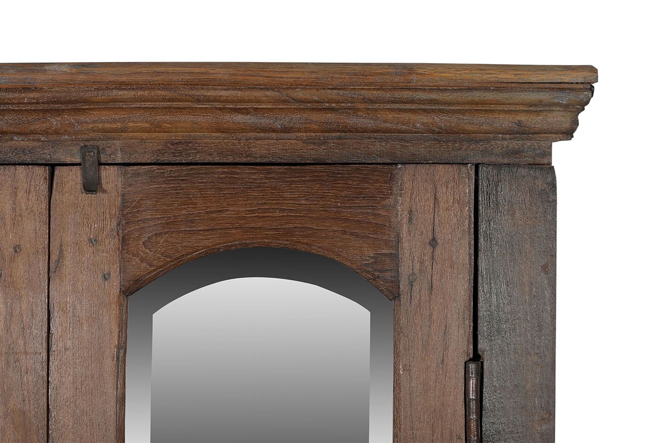 Dieser zweitürige Spiegelschrank aus recyceltem Massivholz vereint zeitlose Funktionalität mit rustikalem Vintage-Charme. Die warme, braune Naturfarbe des Holzes, durchzogen von sanften Gebrauchsspuren, erzählt von vergangener Handwerkskunst und verleiht dem Schrank eine authentische und gemütliche Ausstrahlung.